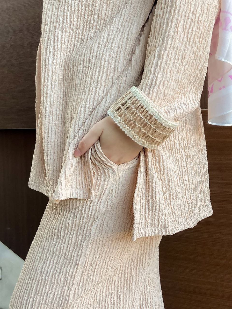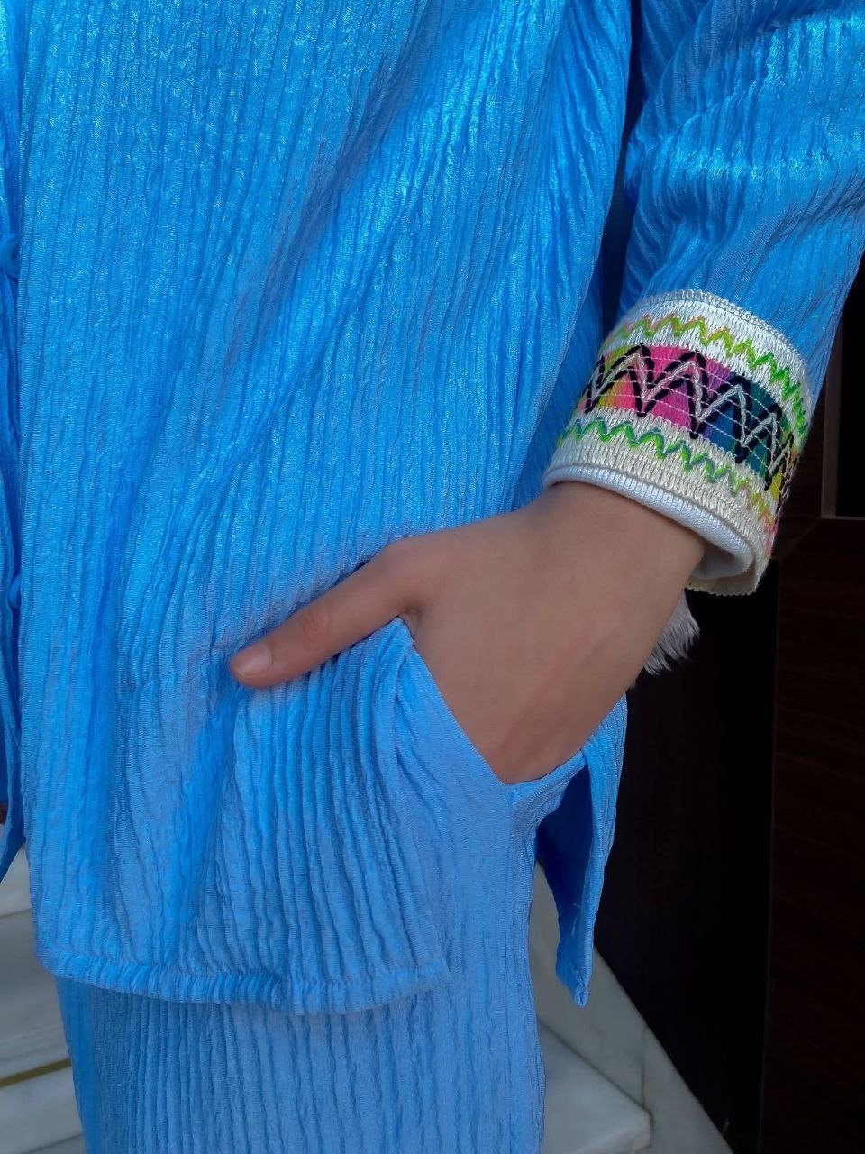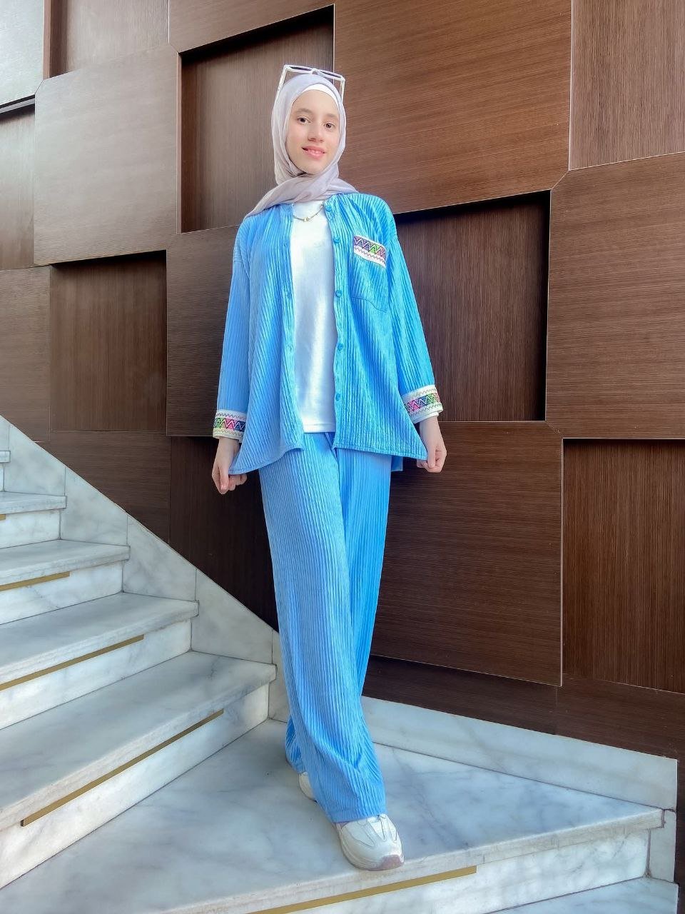 - ديزاين مكونة من قطعتين توب زراير أمامية جيب علوى – الكم مطعم بجوبير بنطلون وايد ليج – 2جيب