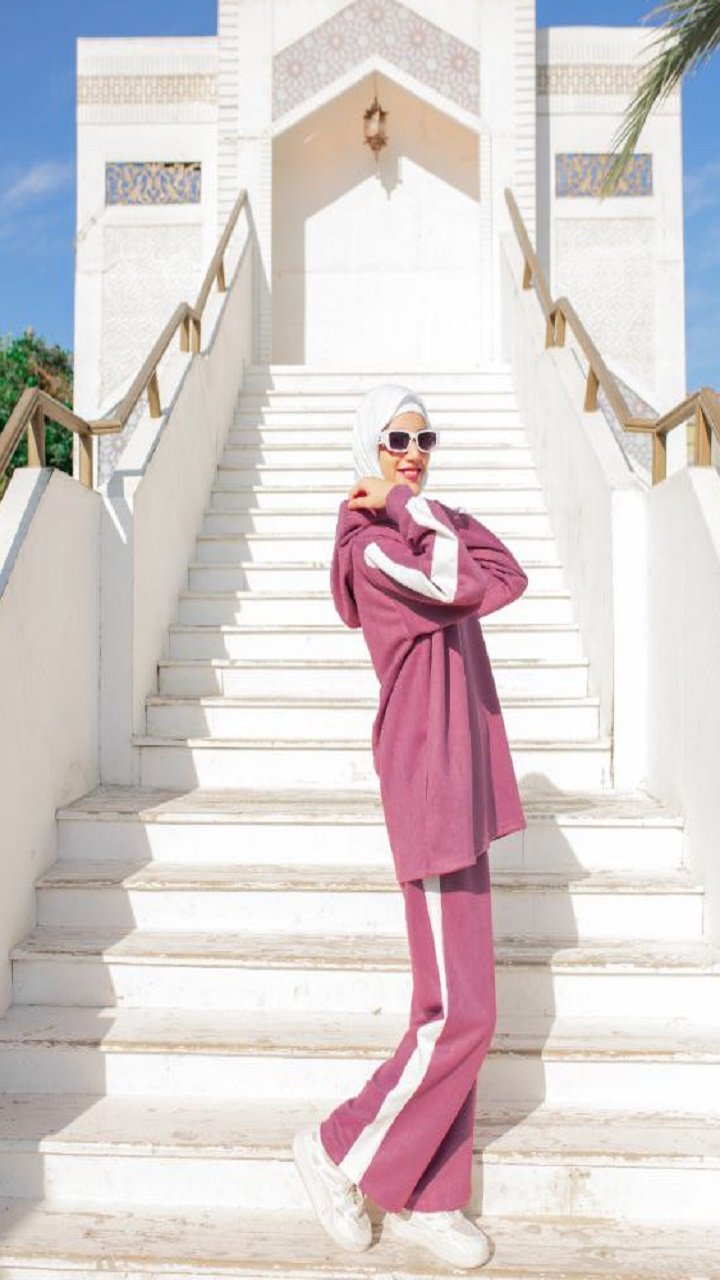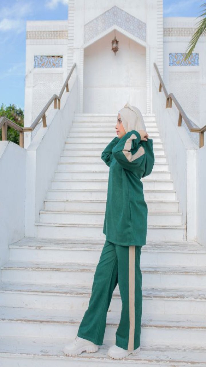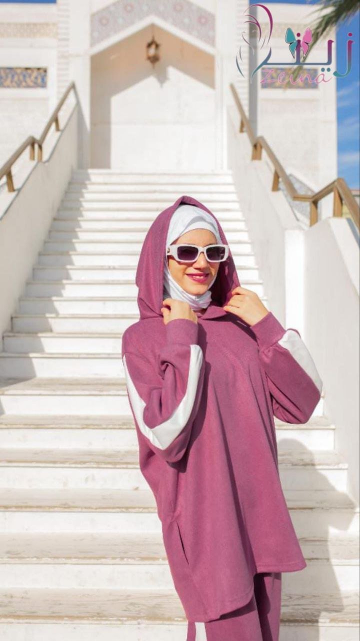 الخامة سويد شمواة ناعم ومريح مكون من قطعتين توب بكابى شو وجيوب و شريط بلون مختلف على الكم + بنطلون وايد ليج مريح وفضفاض وجيوب عملية